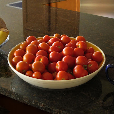 Morandi inspired Still Life, Chapter 2, #16 Large bowl of small tomatoes, part of a banana