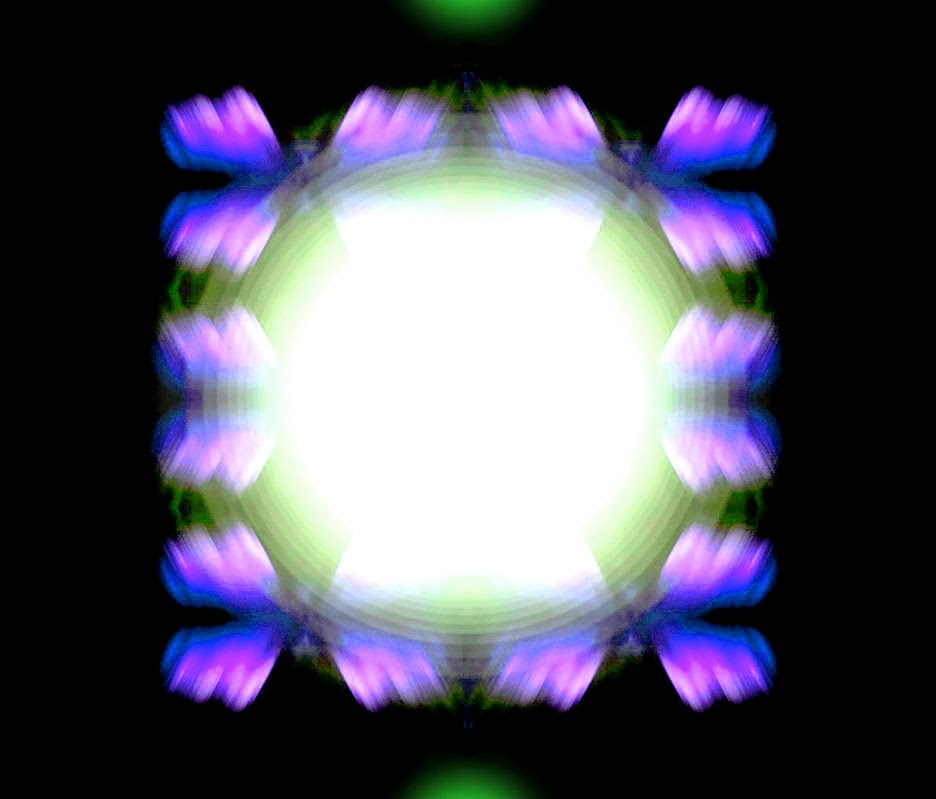 We see angels thorough the eyes of the heart, through the mirror of the suprasensory inner eyes of God, according to Corbin, Cheetham and their mystics. The symmetrical images transform a single source photograph and its reflections into an image of Light suspended in black space. These images are for me a visual celebration of the Unity of Being. The blackness in which the images are suspended is itself illuminated by the sacred light of grace represented by the green orbs on the top and bottom edges of the black borders. When the Sufi traveler completes his inner journey back to his Origin he experiences the brilliance of the outburst of this green light, the splendor of the visio smaragdina, which announces and celebrates the Sufi's reunion with his Creator via his conjunction with his Celestial Twin, or Angel Guide.