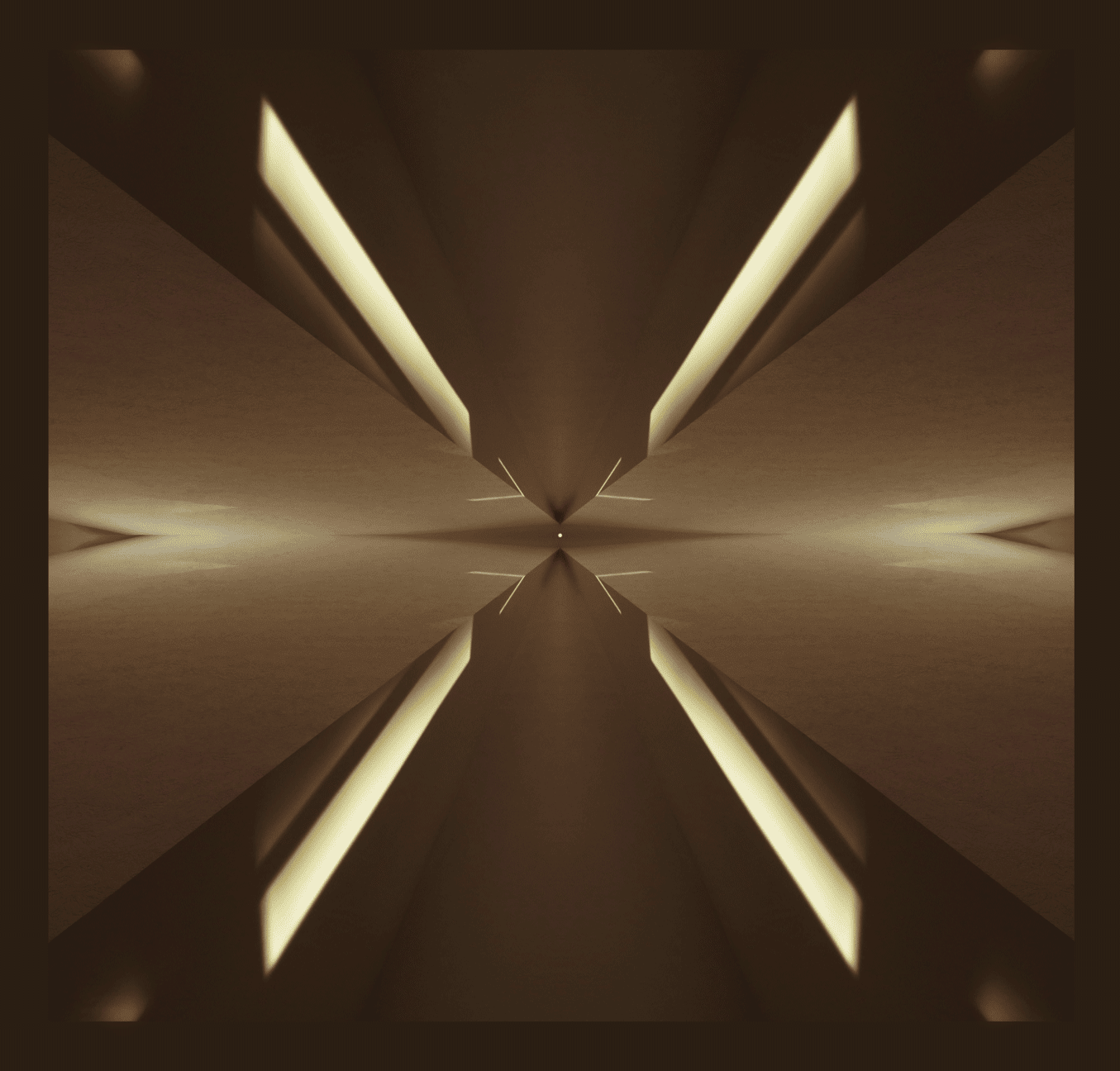 The source image from which I constructed the symmetrical photograph was light and shadow falling across some laced curtains which were hanging over a window in our house. There is a sense of pulsating expansion in the image. That is to say, the image seems to enlarge and project out from its center. The pulsating rings of light and shadow suggest an ever widening expansion . . . like the circular waves that form and spread out over the still surface of a bottomless, infinitely large lake when a stone is tossed into the water. ~ Also, perhaps there is some visual referencing of a compass in the lines that intersect and surround the image. ~ Where are we going? then, if this image is serving as our directional guide?