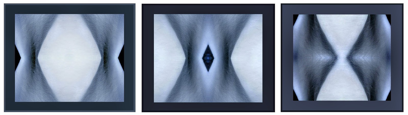 Just a quick technical note: the symmetrical images for this project have been created with high resolution png. digital files. The png. formatting for web publication gave me the ability to more accurately render the blues in my images onto the blog pages. It also allowed me to render my images with a great about of sharp image-texture detail which I thought was important for you to see up close. I hope you will zoom in on the images and study more closely. The drawback to this formatting option is that it may have taken your computer more time to open the images when you clicked on the project page link. (Also, the notoriously--and shamefully--slow internet service that the corporations provide most of us here in the United States is another reason why my project pages may open slowly for you.)