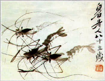 The photograph reminds me of several paintings I have seen of shrimp and other sea creatures (see image below) by the modern Chinese painter Qi Baishi (1864-1957). He writes: These crayfish I paint are unlike those you usually see: what I seek is not "formal resemblance" but "spiritual resemblance," and that is why the crayfish that come from my brush are "alive."