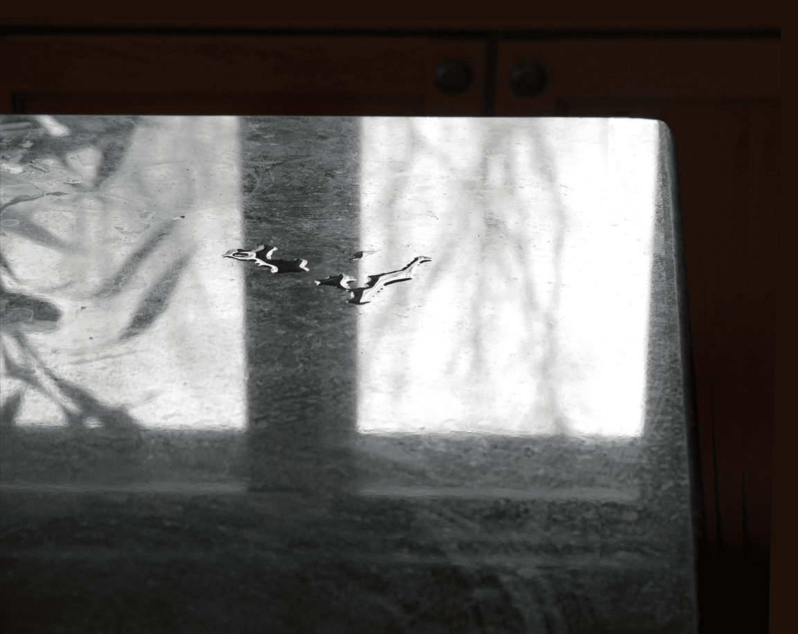 "Spilled water and reflections in kitchen counter" Zen Practice Photograph Part 8 Snow: Silver World Image #8